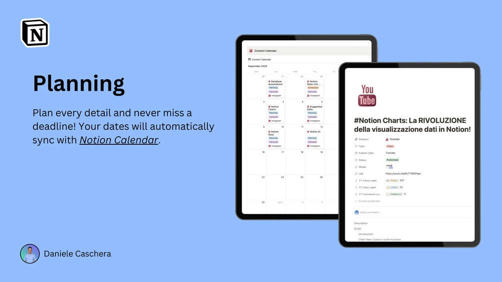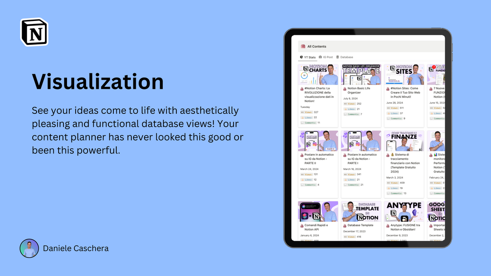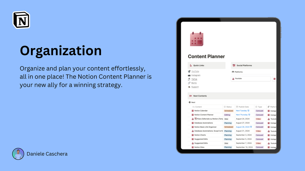 I'm Daniele, the creator of the Content Planner template dedicated to helping content creators improve their content management and optimize their work with Notion.