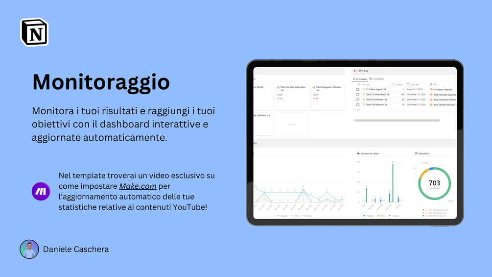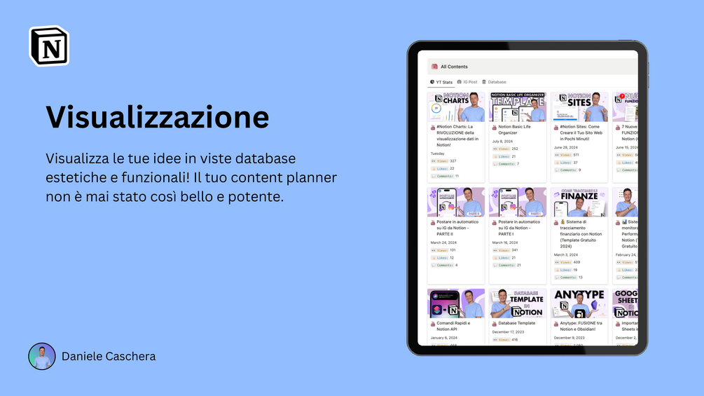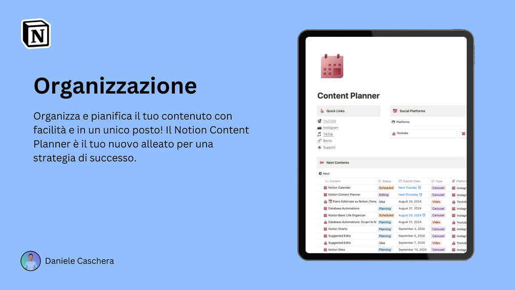 Sono Daniele, il creatore del template Content Planner dedicato ad aiutare content creators a migliorare la propria gestione dei contenuti e ottimizzare il proprio lavoro con Notion.