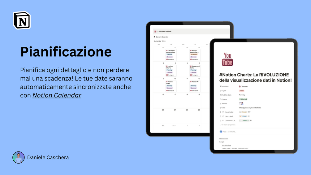 Sono Daniele, il creatore del template Content Planner dedicato ad aiutare content creators a migliorare la propria gestione dei contenuti e ottimizzare il proprio lavoro con Notion.